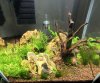 Ich konnte es nicht lassen und habe noch zwei Pflanzen untergebracht. Jetzt müssen die alle erstmal fleißig wachsen. Eingezogen sind ein Töpfchen Rotala indica und ein Topf Riccardia chamedryfolia (Ich liebe diese ganzen Pflanzennamen). Die Riccardia habe ich teilweise auch ein wenig in den Boden gestopft, mit der Idee, dass sie als Bodendecker fungiert. Hab erst im nachhinein gelesen, dass sie eigentlich nur aufs Hardscape soll ...Anfängerfehler halt :rolleyes: Hat da jemand Erfahrungen, ob das was werden kann?
