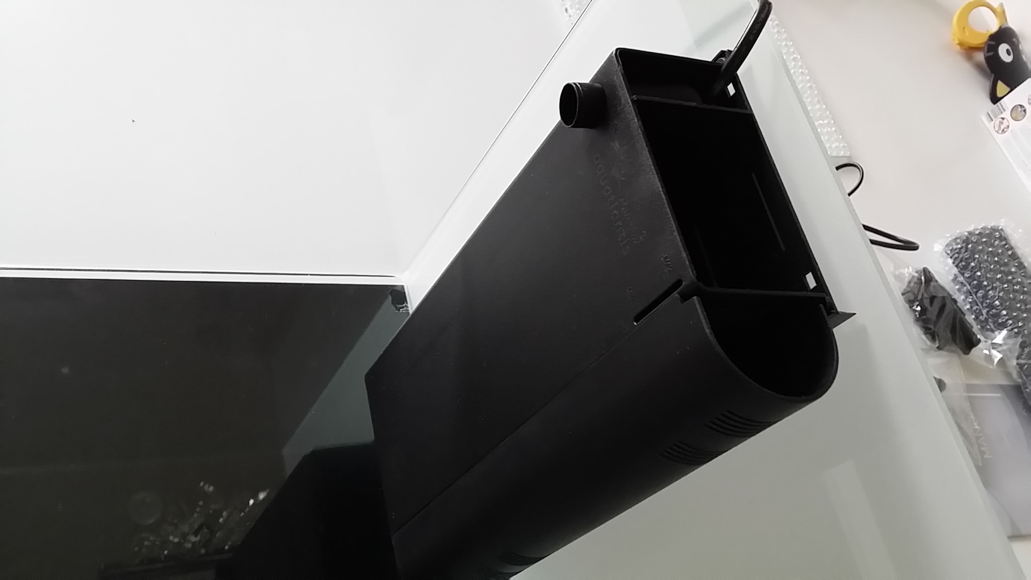 Nochmal der leere Filterkasten. Die Wasserpumpe (200l/h) ist schon drin, wie man am Kabel sieht. Man kann sie komplett herausholen bei Bedarf. Sie ist auch regelbar.