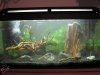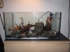 Meine Idee mit den Steinen auf dem Boden funktioniert noch nicht so richtig. Sieht irgendwie sehr unstrukturiert aus, da muß ich heute noch mal ran. Die Wurzeln sagen mir auch nicht so zu. Die sind doch größer als erwartet und das Becken wirkt total überfüllt.Ich befürchte, wenn ich rechts nen größeren Stein einbringe, muß die rechte Wurzel verschwinden. Die linke bleibt auf jeden Fall, die kann, mit etwas aufgebundenem Moos, schön einen kleinen Baum/Wald simulieren. Zu guter Letzt habe ich dann Wasser eingefüllt, zum einen um die Wirkung beurteilen zu können, zum anderenum die Wurzeln weiter zu wässen. Die eine hat sich nämlich schon wieder auf den Weg nach Oben gemacht. Den Filter habe ich nicht eingesetzt, ich hätte auch gar keinen Platz dafür. Auf die Lieferung des Alternativfilters warte ich immer noch... Heute Nachmittag gehts weiter mit der Bauerei :-)