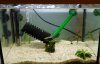 Ich gebs zu, ja, der mitgelieferte Filter ist eher für kieslose Becken gedacht. Ich habe den Filter links in die Ecke gepappt und unter der Schwammpatrone den Kies bis auf ca. 5 mm weggeschoben. Faulheit eigentlich. Denn für meinen noch viel niedrigeren 10l Cube habe ich den gleichen Filter in Nutzung, da habe ich das Luftheberröhrchen einfach um 50% gekürzt, passt!